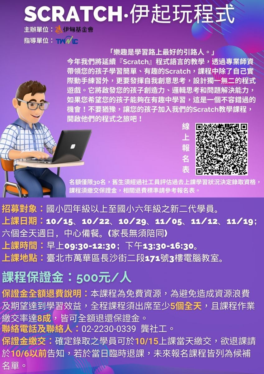 4.注意事項:課程名額僅限30名,舊生須經過社工員評估過去上課學習狀況決定錄取資格;課程須繳交保證金500元,相關退費標準請參考DM及報名表單。