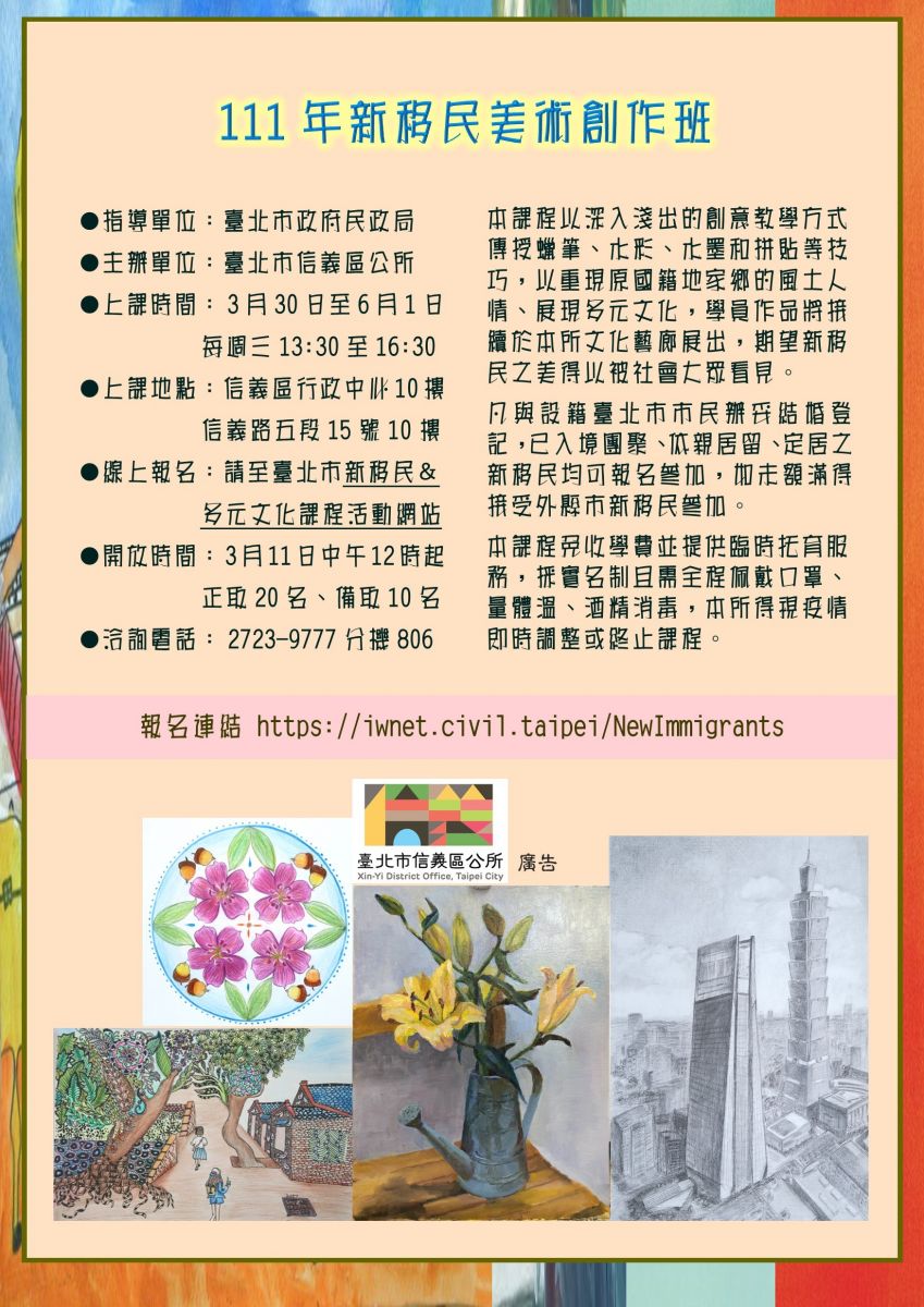 【轉知】臺北市信義區公所-111年度新移民美術創作班