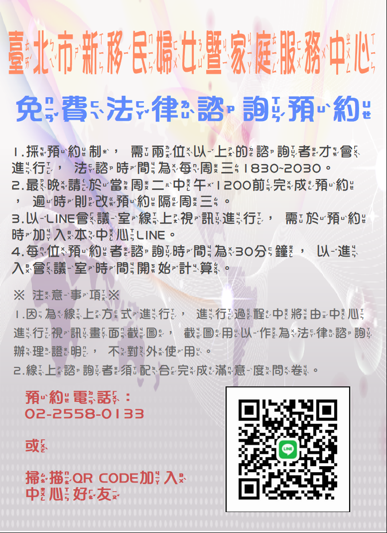 【公告】新移民中心法律諮詢開放預約,諮詢方式因應疫情有所更動,請協助宣廣,詳細預約、諮詢方式如附件資料。