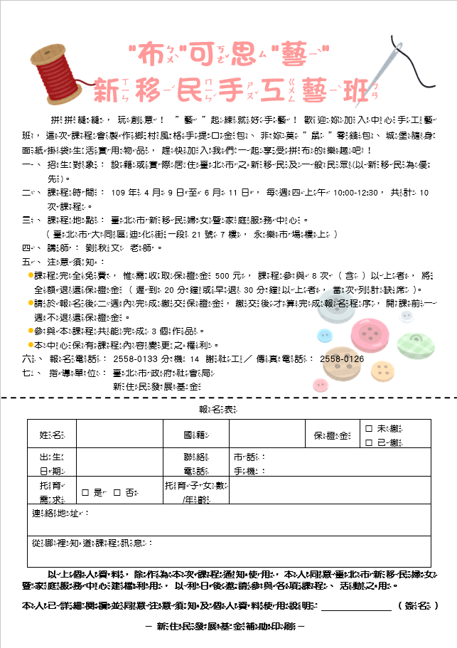 一、招生對象:設籍或實際居住臺北市之新移民及一般民眾(以新移民為優先)。 二、 課程時間:109年4月9日至6月11日,每週四上午10:00-12:30,共計10次課程。 三、 課程地點:臺北市新移民婦女暨家庭服務中心。(臺北市大同區迪化街一段21號7樓,永樂市場樓上) 四、 報名電話:2558-0133分機14 謝社工/傳真電話:2558-0126