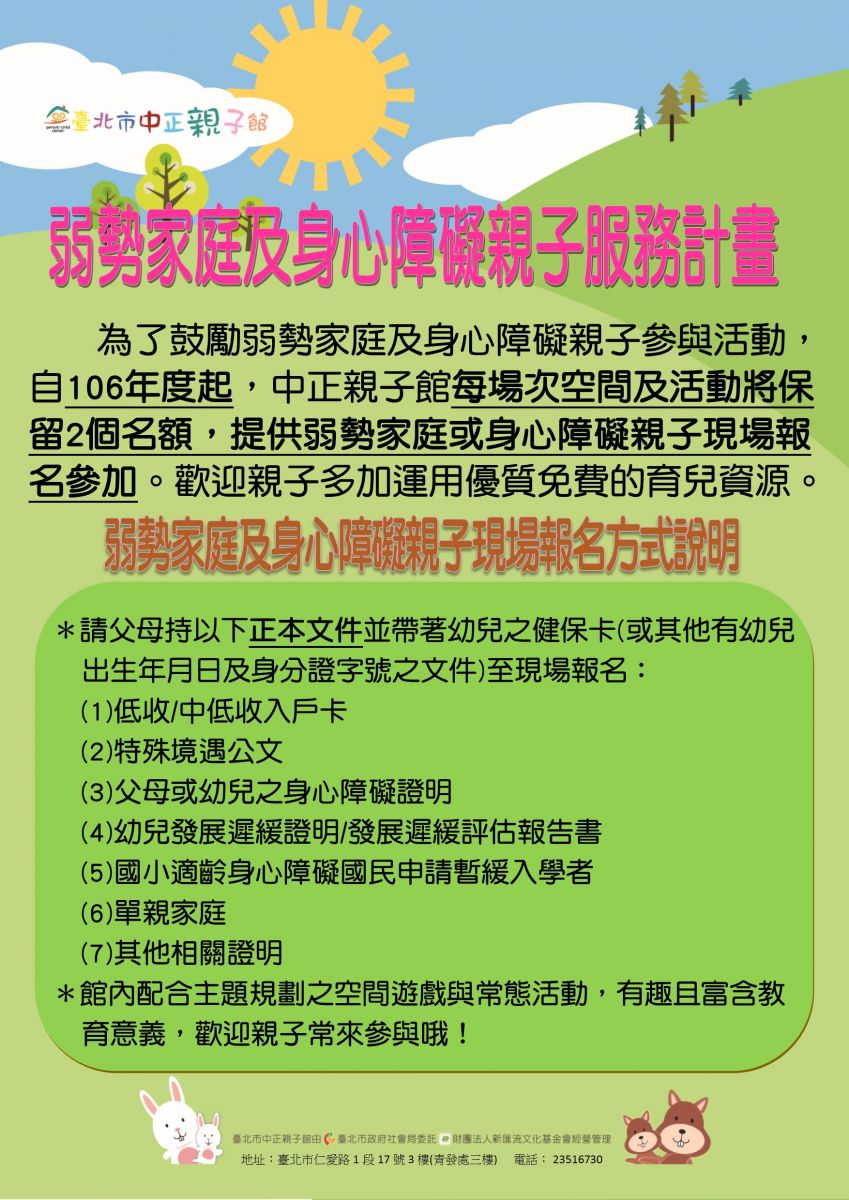 館內保留2個名額(活動/空間)提供給發緩/身障/弱勢家庭