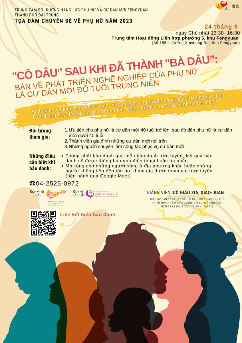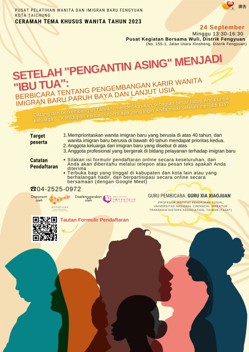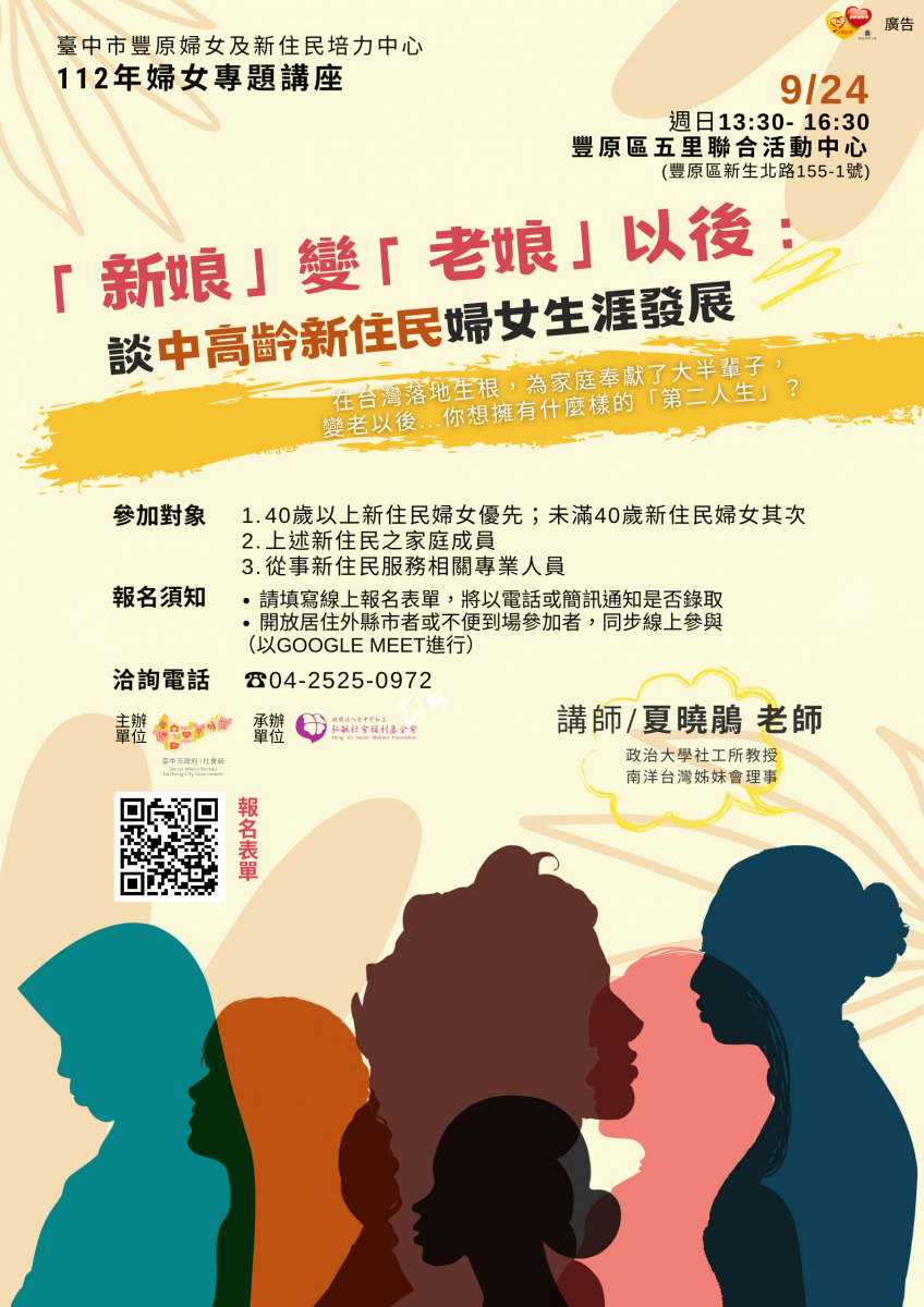 【轉知】臺中市豐原婦女及新住民培力中心-敬邀線上參加9/24(日)專題講座-「新娘」變「老娘」以後:談中高齡新住民婦女生涯發展