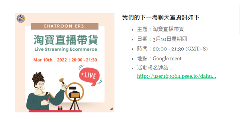 【轉知】大話中文聊天室-免費提供新住民、外籍移工中文學習機會 親愛的朋友你好: 我們是大話中文,專門為學習中文的人做的雜誌。 我們三月十日晚上八點會有一個「免費」的活動,讓你可以邊學中文,邊在台灣交朋友。 Hi friends, We are Dahua Chinese, a biweekly magazine for Mandarin Chinese learners. We are going to have a FREE chatroom activity at 8 p.m., 10th, March. Welcome to join us and make friends here!