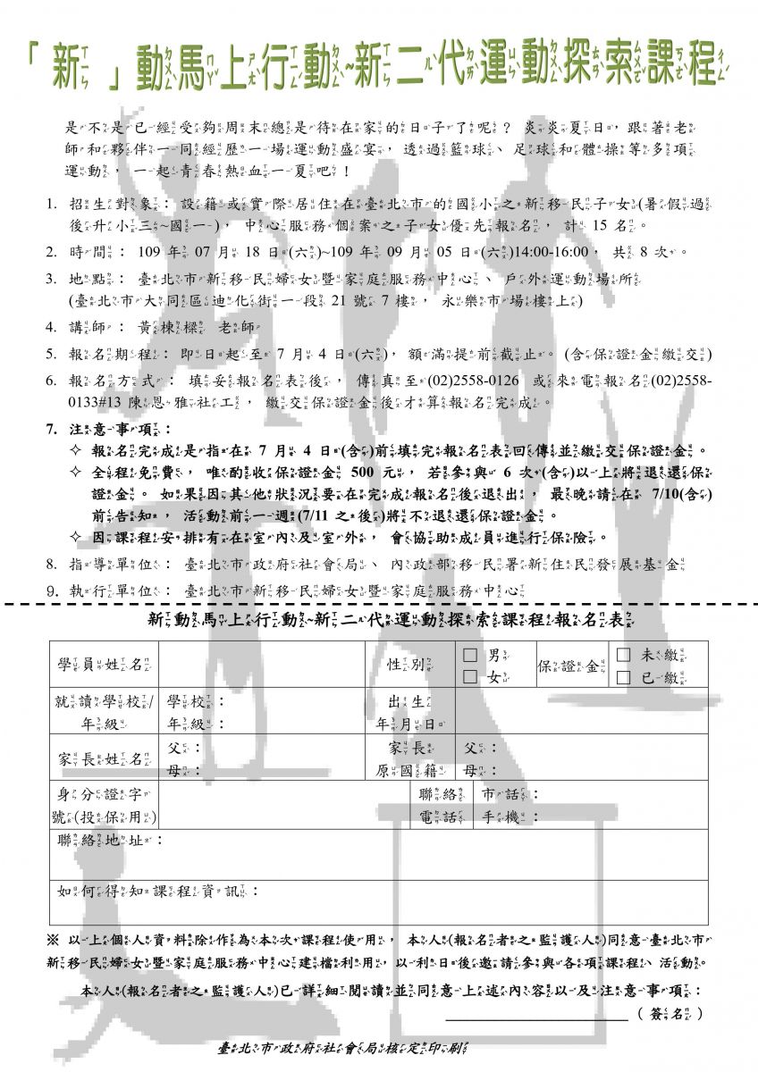 新移民中心於109/7/18~9/5每周六下午14:00-16:00辦理新二代運動探索課程,