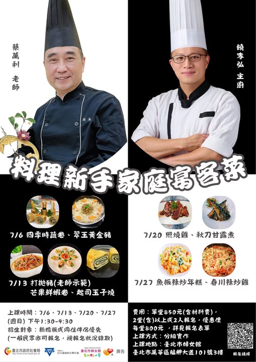 【轉知】婦女館新課程-料理新手家庭宴客菜(收費課程)