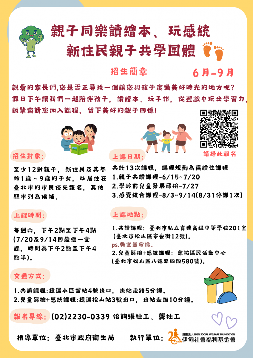 【轉知】伊甸基金會新移民家庭成長中心-親子同樂讀繪本、玩感統-新住民親子共學團