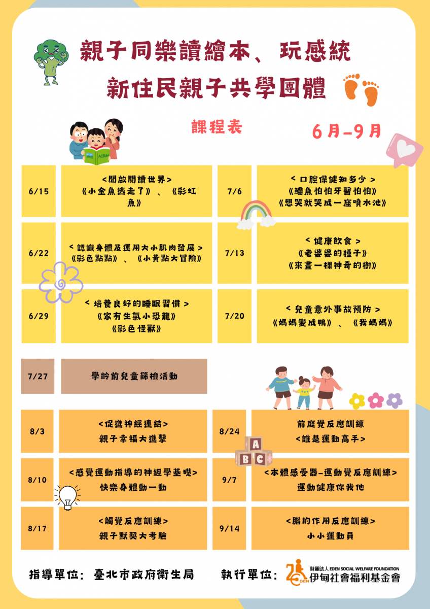 課程內容:前6堂課親子共讀+學齡前兒童發展篩檢(1場次)+後6堂課感覺統合課程。
