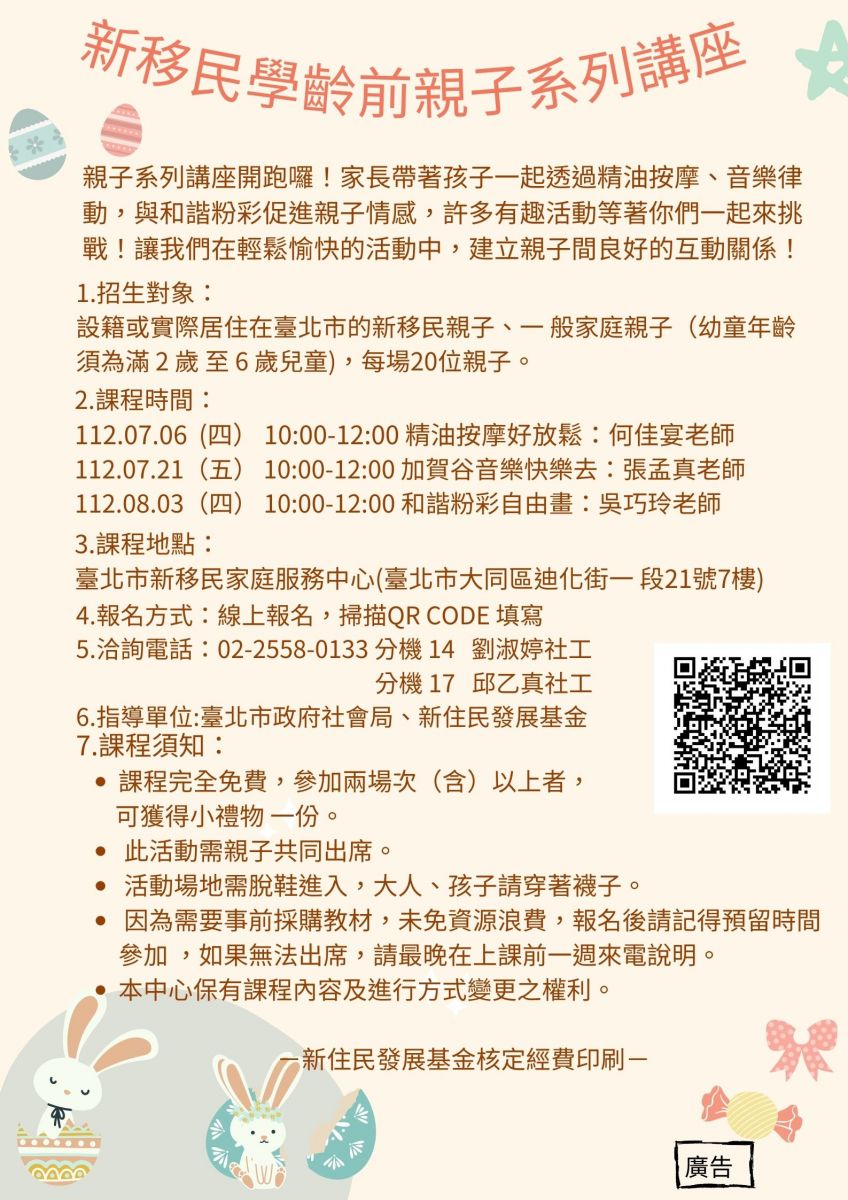 *招生對象:設籍或實際居住在臺北市的新移民親子;一般家庭親子(幼童年齡須為滿2歲至6歲兒童)每場20位親子