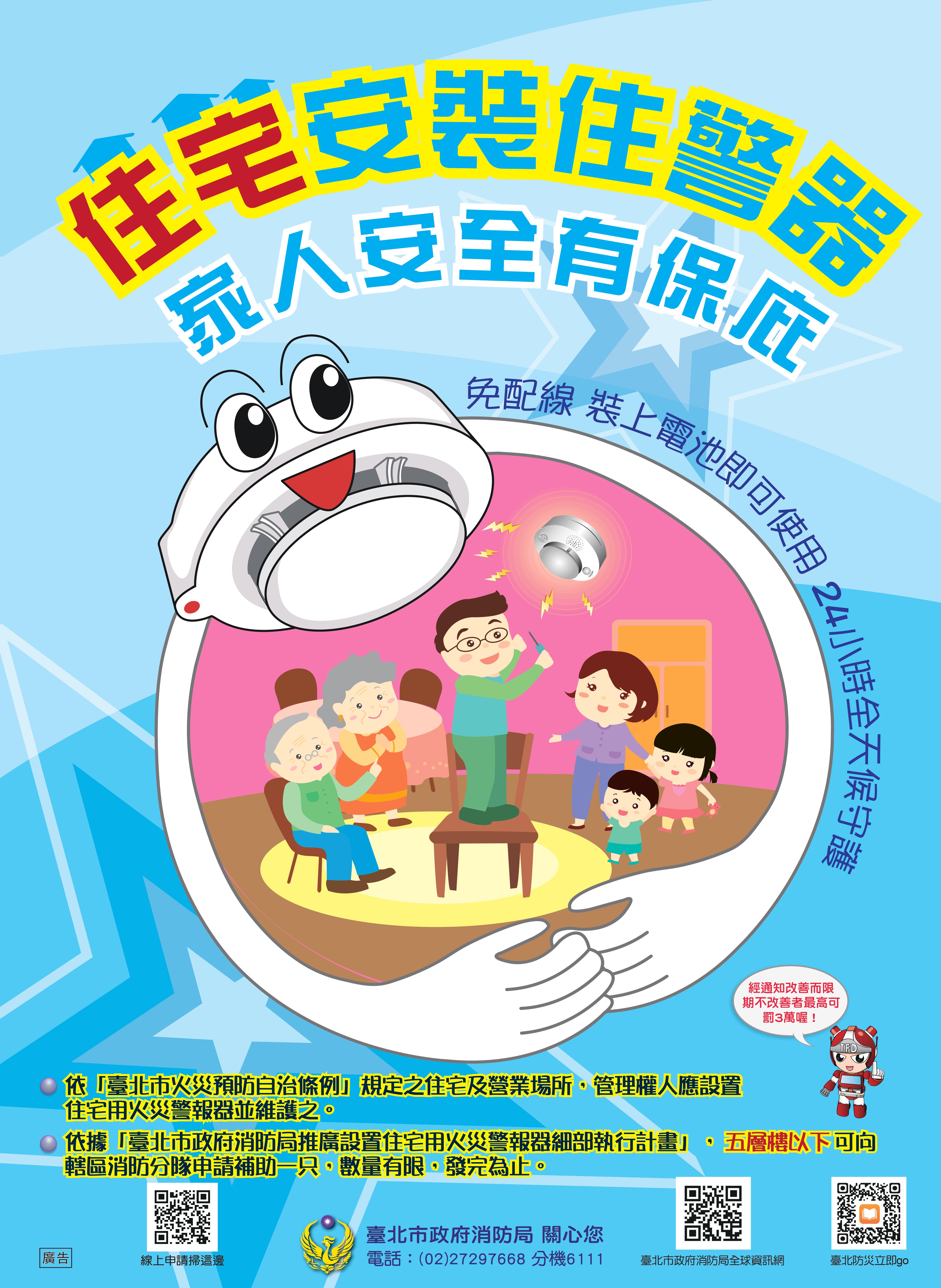 本日宣導民眾住宅用火災警報器應安装於每樓層寢室、樓梯、走廊等處所,定時清潔及檢測電池電力,同时鼓勵民眾安裝連動型住宅用火災報警器並移報輸出至其它連線裝置(如手機等),以達到遠距及早發現、及早反應、及早逃生的目的。