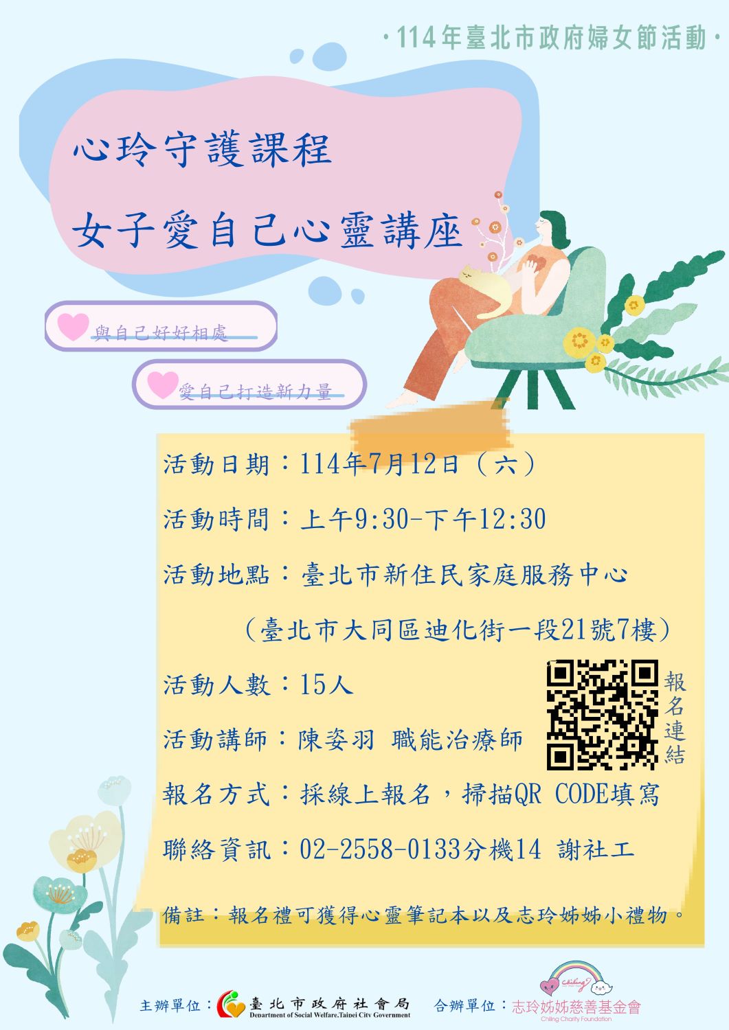 誠摯邀請您參加由志玲姊姊基金會與我們攜手合作辦理的心玲守護課程-女子愛自己心靈講座~在課程中,除了可學習到如何愛自己、照顧自己的心靈外,亦引導大家認識情緒、建立內在力量,打造更溫柔與堅定的自己。
