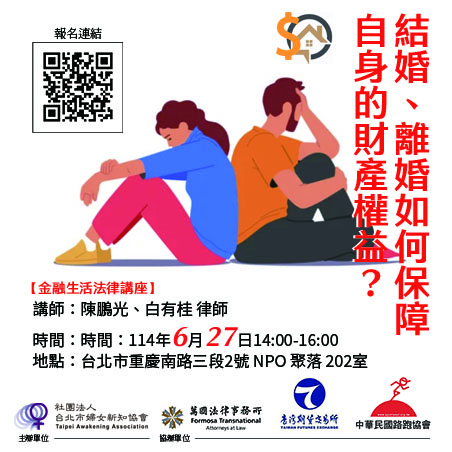 【轉知】社團法人台北市婦女新知協會-【金融生活法律講座】結婚、離婚如何保障自身的財產權益?