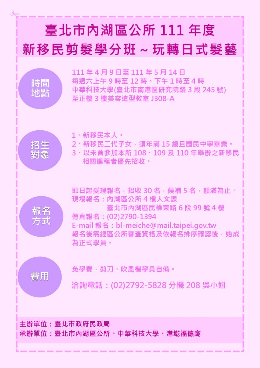 【活動轉知】內湖公所新移民剪髮學分班-玩轉日式髮藝