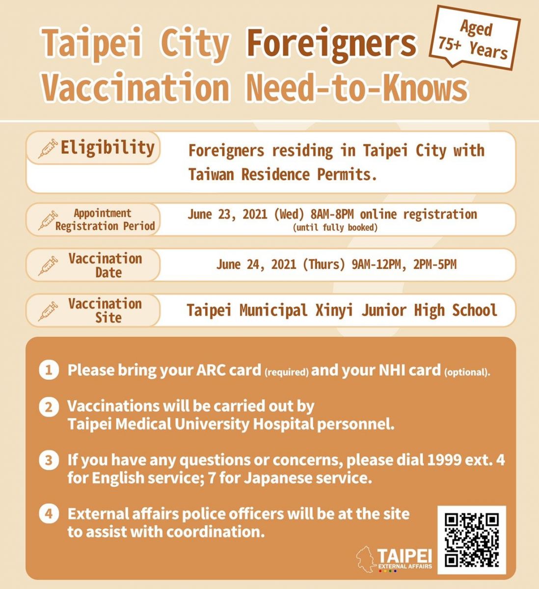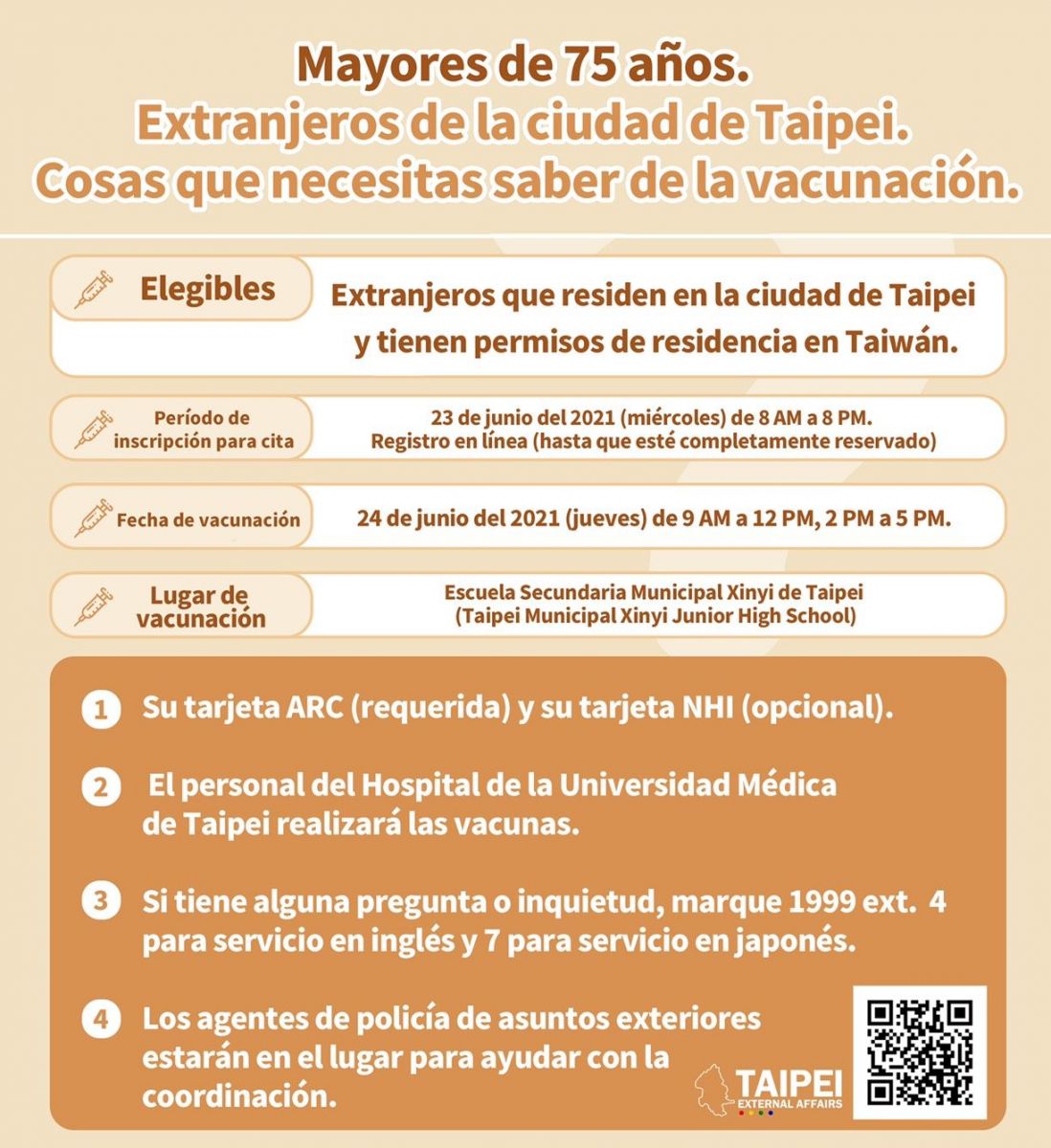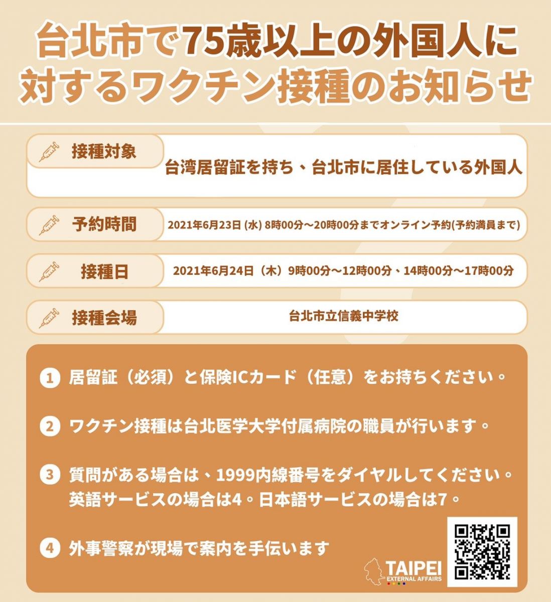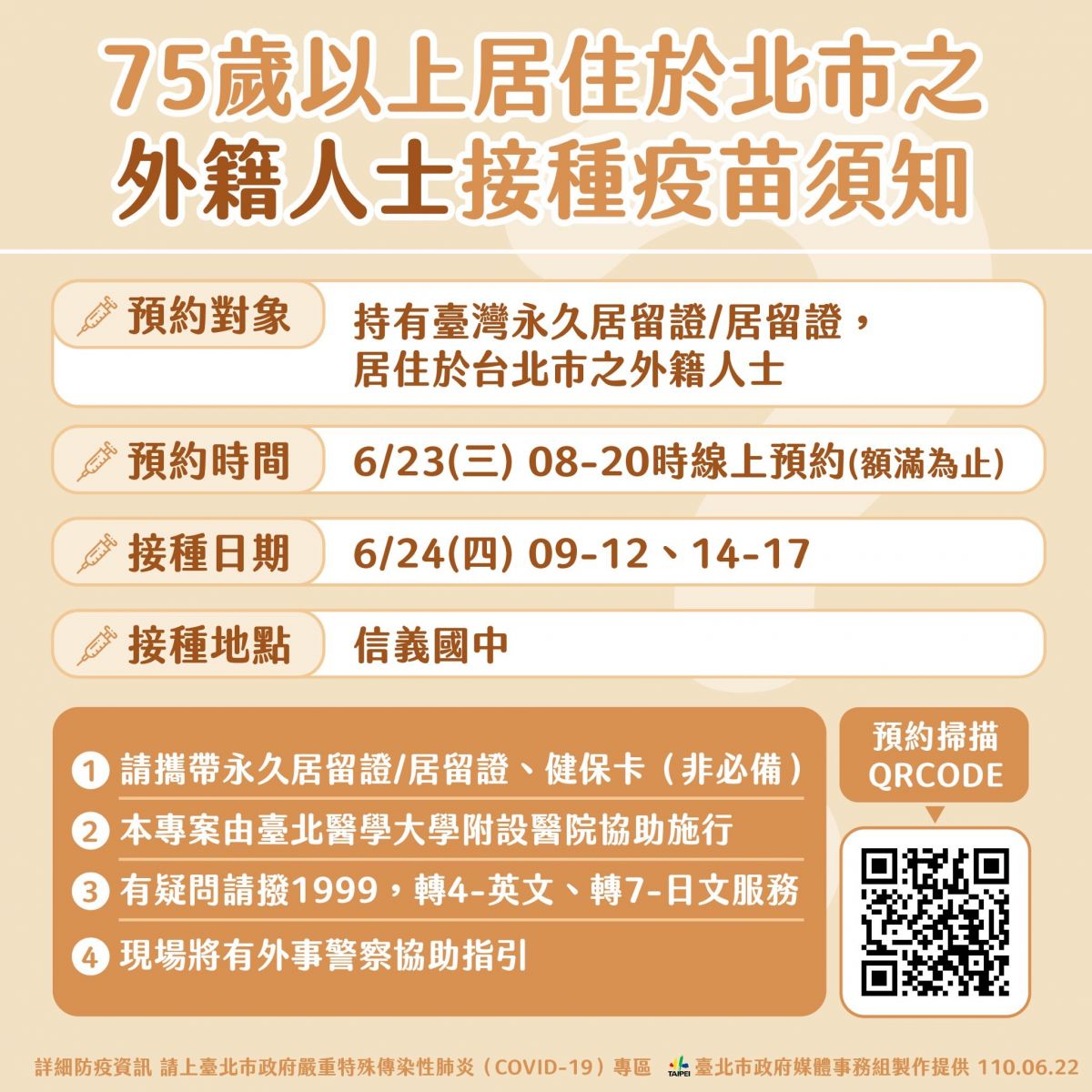 居住於臺北市75歲以上且持有居留證之外籍長者,請於110年6月23日上午8時至下午8時於台北醫學大學附設醫院COVID-19疫苗接種登記系統預約接種,並於110年6月24日(四)上午9時至12時、下午2時至5時攜帶居留證及全民健保IC卡(非必備),前往信義國中(信義區松仁路158巷1號)接種疫苗。