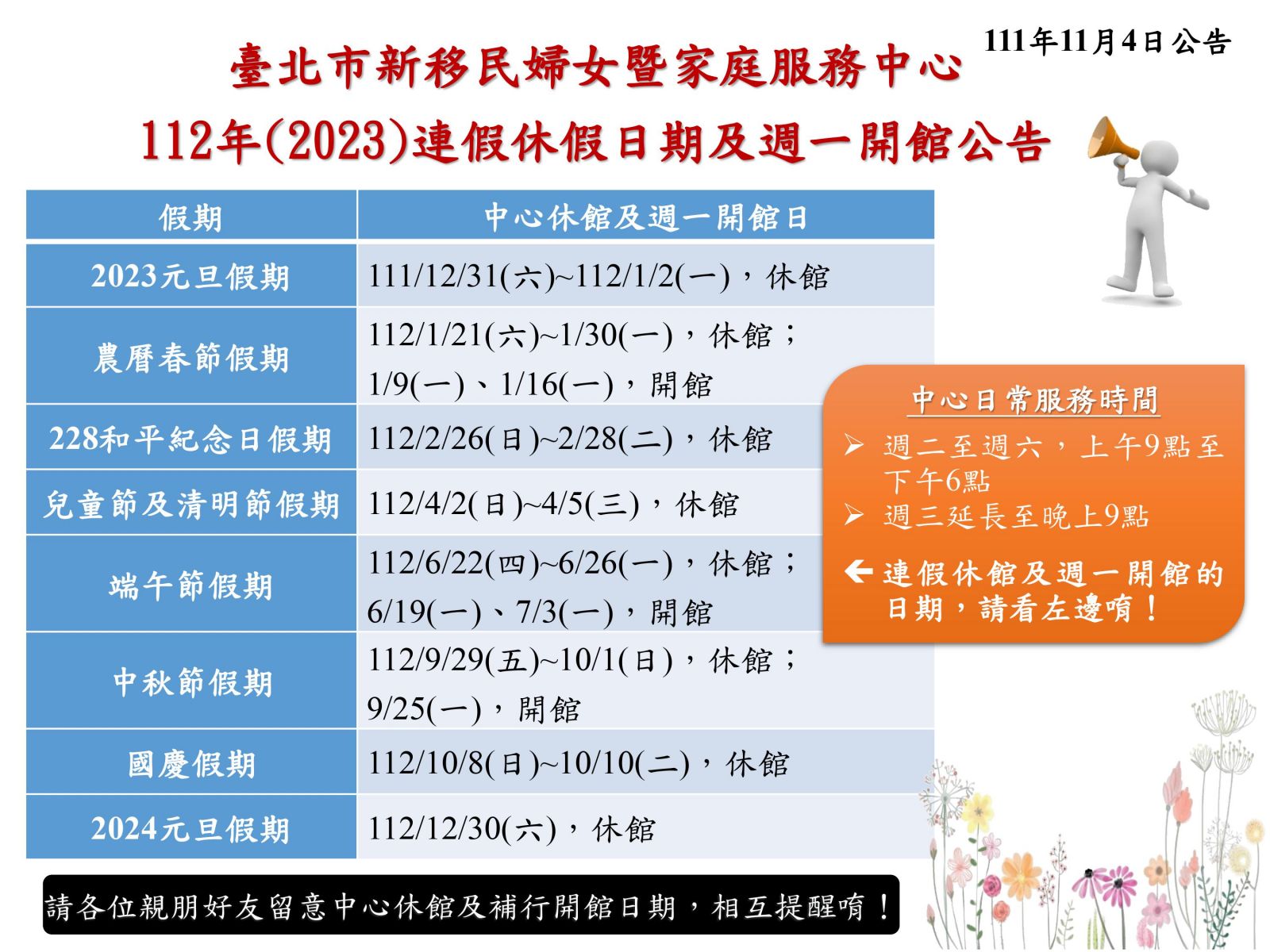 【中心公告】112年(2023)連假休假日期及週一開館公告