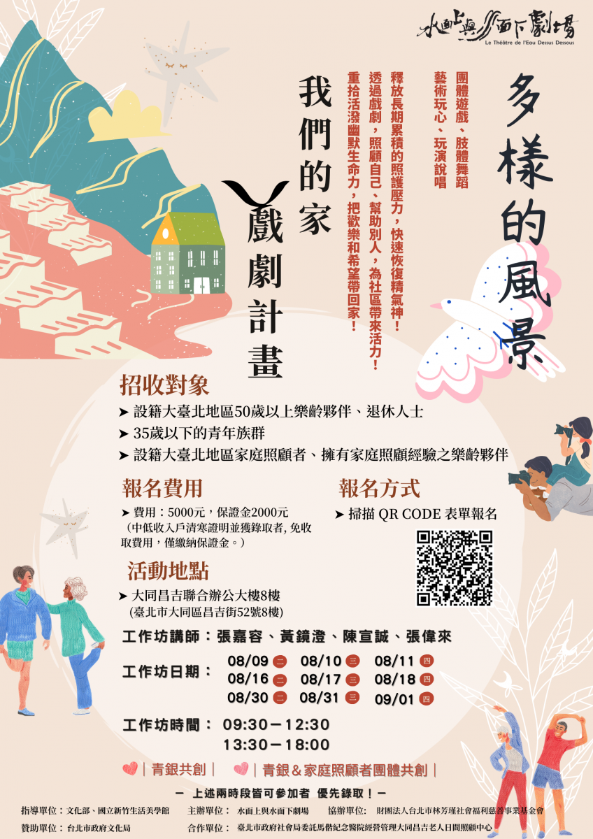 《我們的家》暨《多樣的風景》戲劇計畫將招募三種族群:「50歲以上樂齡族群」、「35歲以下青年族群」、「台北市家庭照顧者」。透過戲劇來探討樂齡人生,社區意識,連結彼此的生命經驗!透過戲劇,促進民眾健康、增加心理韌性,擁有照顧自己和家人的智慧之外,也可以增加情感連結、凝聚社區居民的力量,做為居民健康活力、激發創意、聯絡感情、共同關心社區的方式。