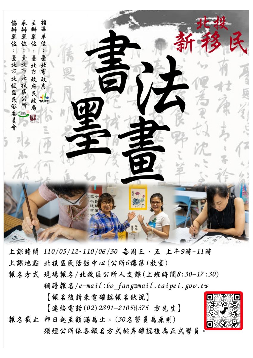 【轉知】臺北市北投區公所-110 年 「新移民書法墨畫班」
