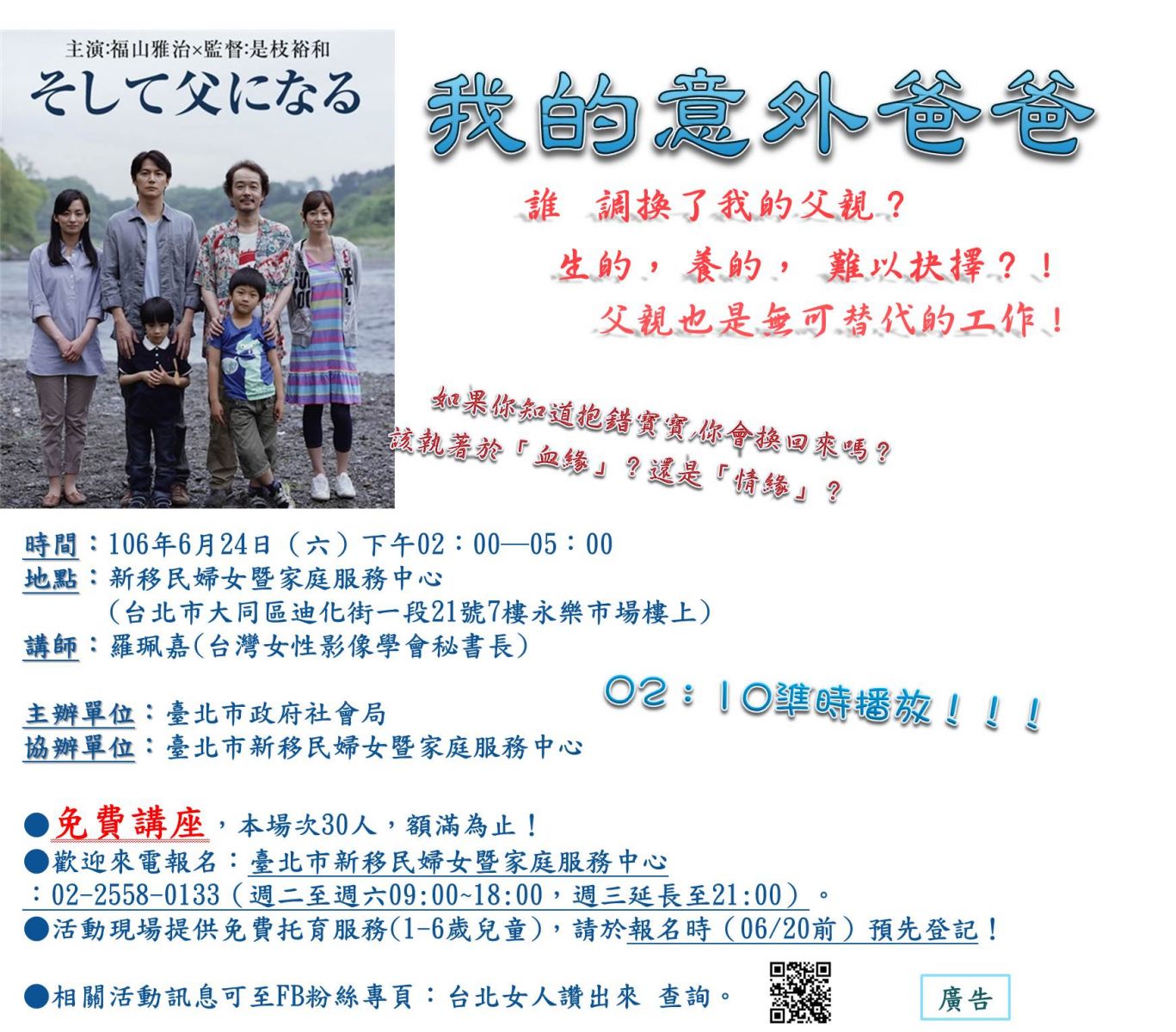 ,有興趣看看不同人生縮影電影的你,請盡速來電(02)2558-0133*13林社工或網路報名