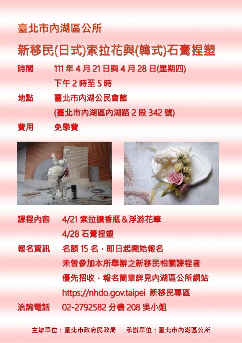 【轉知】內湖區公所-新移民日式索拉花與式石膏捏塑