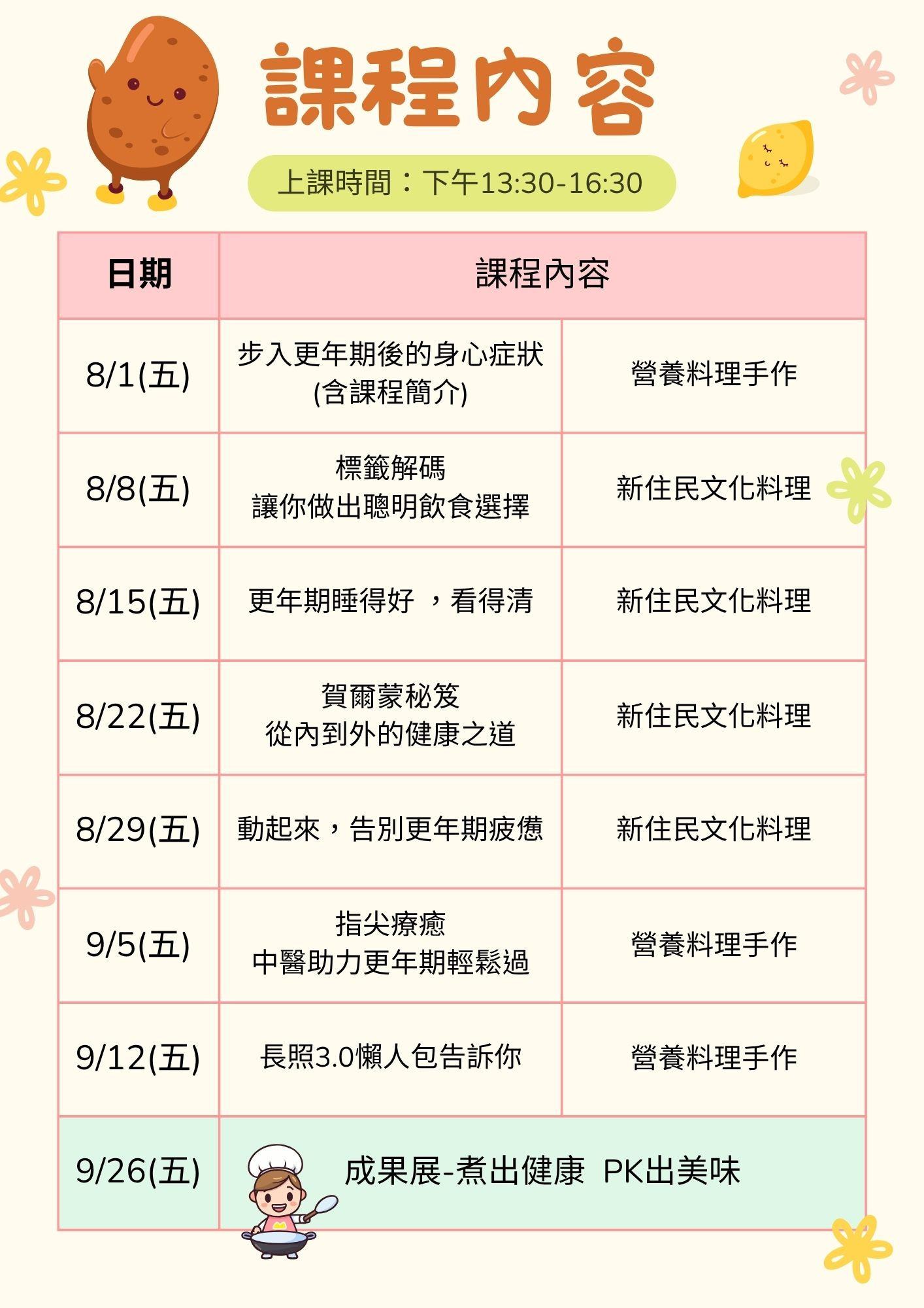 除了認識更年期自我照顧方式外,更從健康的飲食出發,帶您親手製作美味又營養的料理