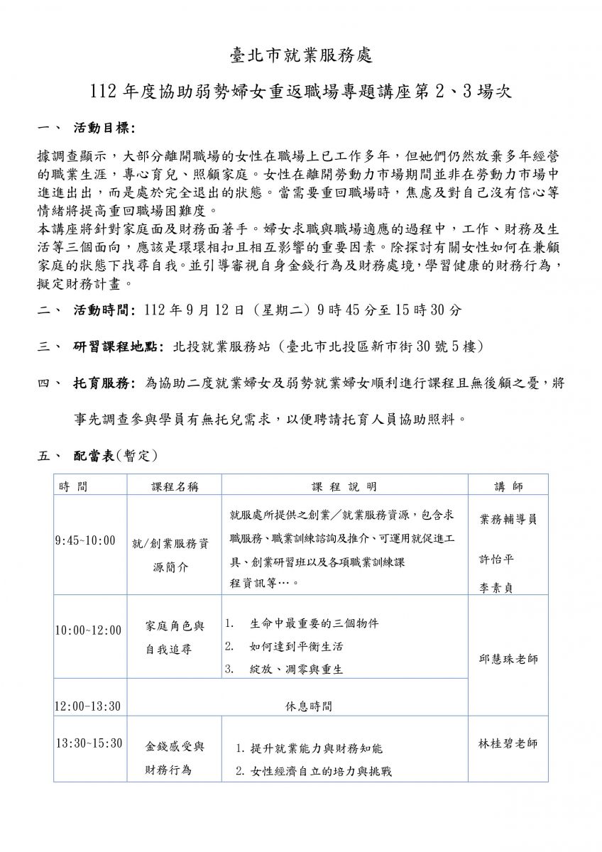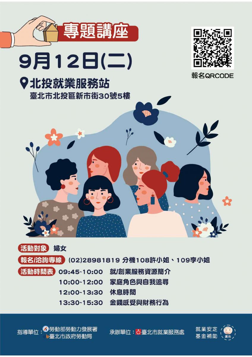 【轉知】臺北市就業服務處-112 年度協助弱勢婦女重返職場專題講座第 2、3 場次