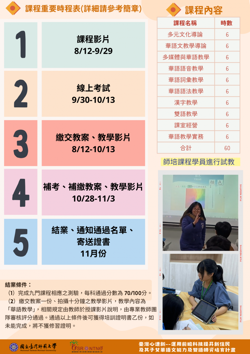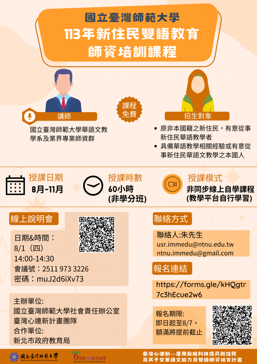 8月至11月將辦理專門提供新住民教師報名的「新住民雙語教師培訓課程(60小時)」,採線上非同步方式進行,歡迎有興趣成為新住民華語老師/教支人員報讀。