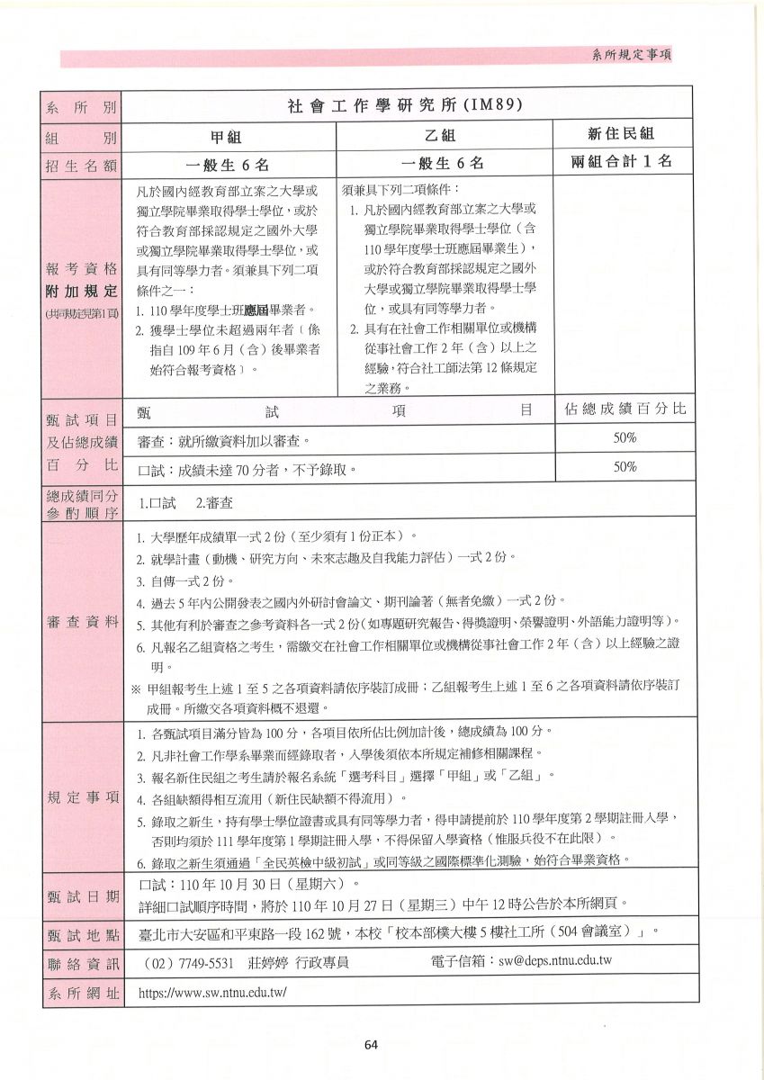國立臺灣師範大學社會工作學研究所111學年度碩士班甄試入學相關資訊