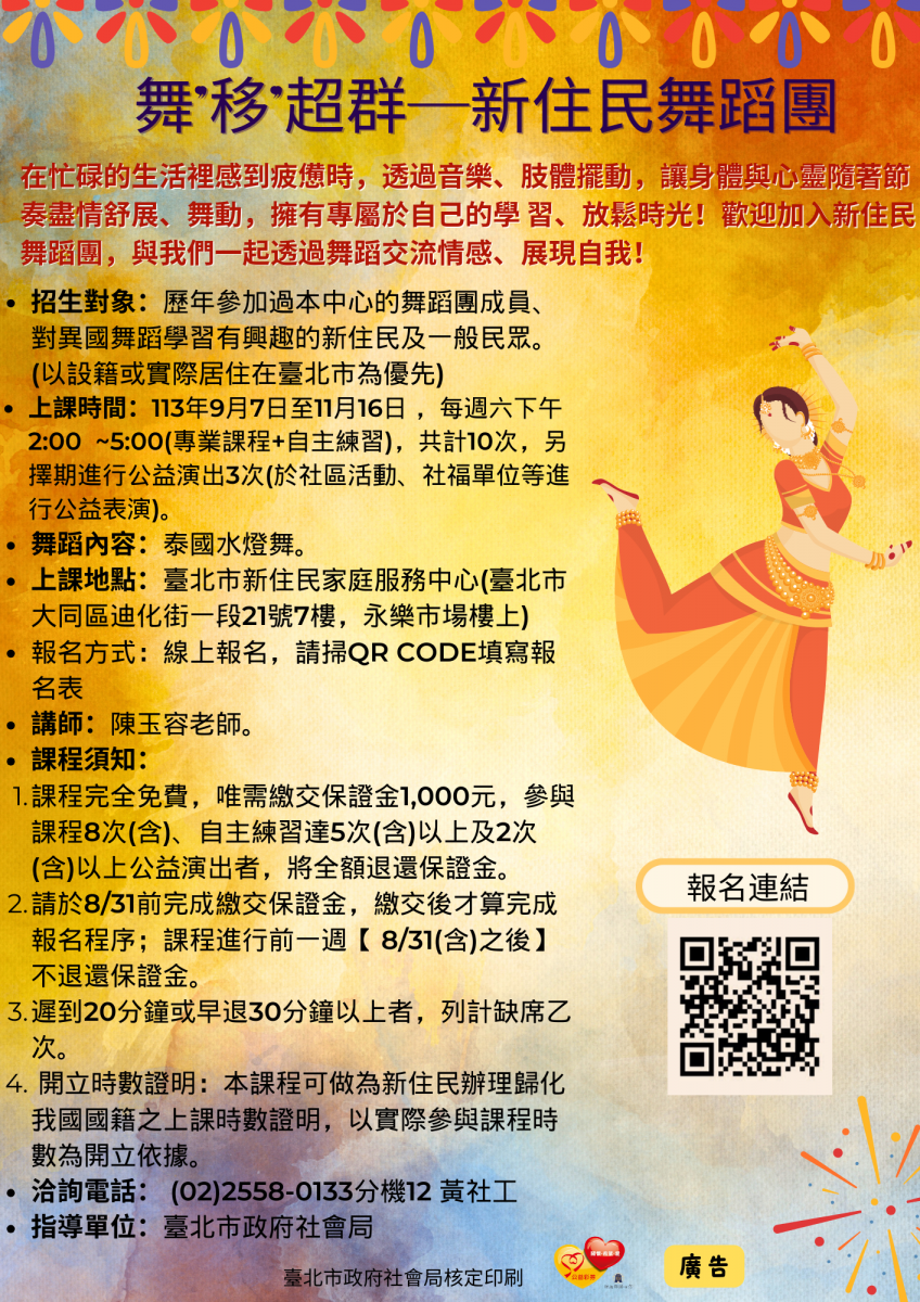 *招生對象:歷年參加過本中心的舞蹈團成員、對異國舞蹈學習有興趣的新住民及一般民眾。(以設籍或實際居住在臺北市為優先)
