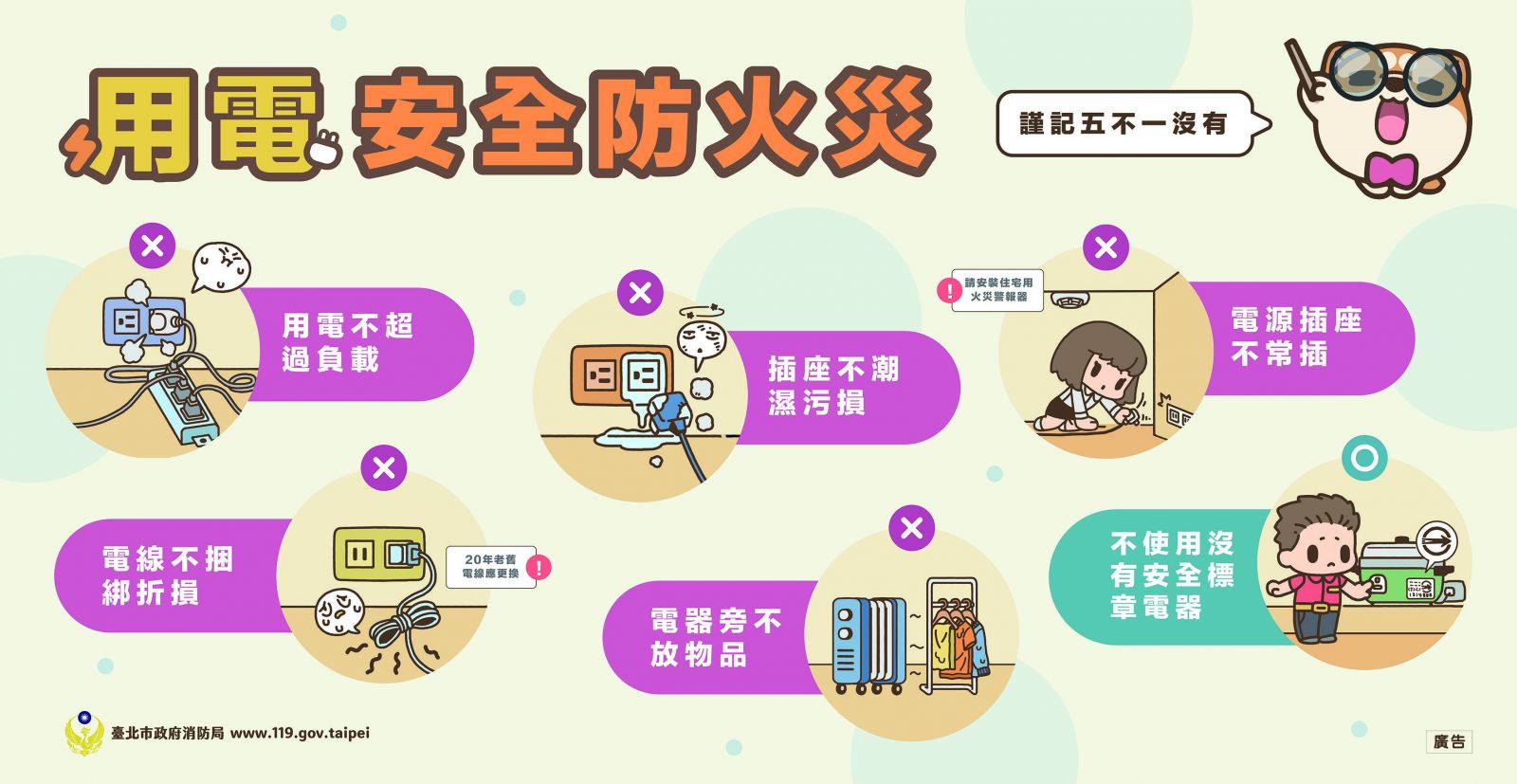 本日宣導民眾用電應牢記「5不1沒有」原則,檢查居家用電危險因子,並予以排除。